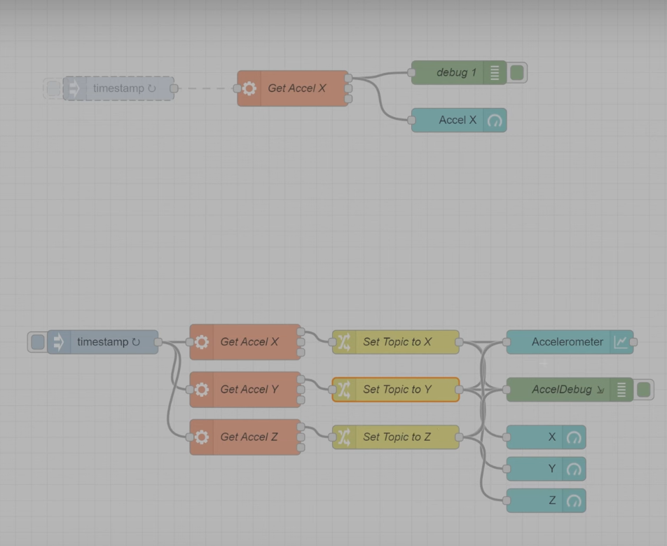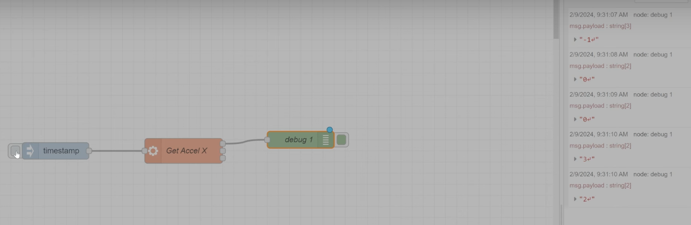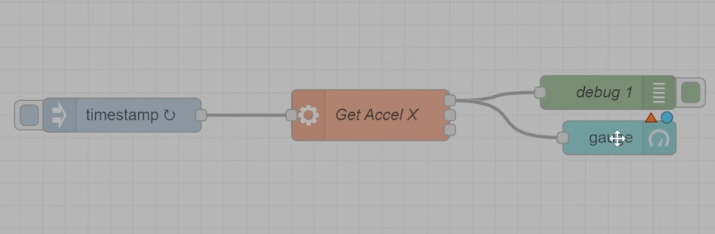 In this flow we’ll take a look at how we can get the accelerometer readings output on the node red console.